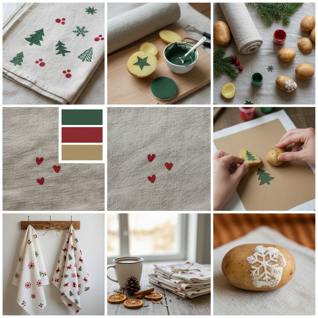 Lay the tea towel flat with cardboard inside to prevent bleed-through. Dip your potato stamp into the paint, then press it firmly onto the tea towel. Repeat to create a pattern.
